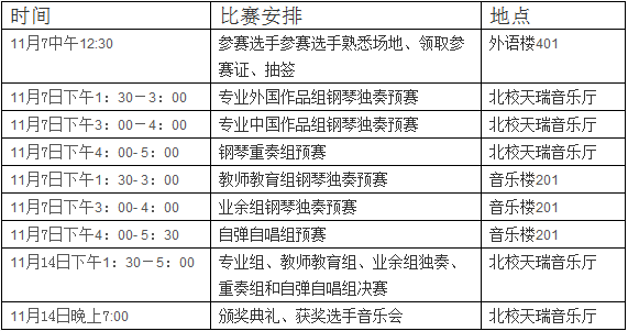 本次比赛分预赛和决赛,比赛形式是钢琴独奏,钢琴重奏(四手联弹、双钢琴等),自弹自唱,不设规定曲目,自选作品一首,限时3-12分钟左右,预赛和决赛可弹奏同一作品(专业组决赛时要求加弹一首指定曲目,谱子和音响资料可在权威博彩网站导航